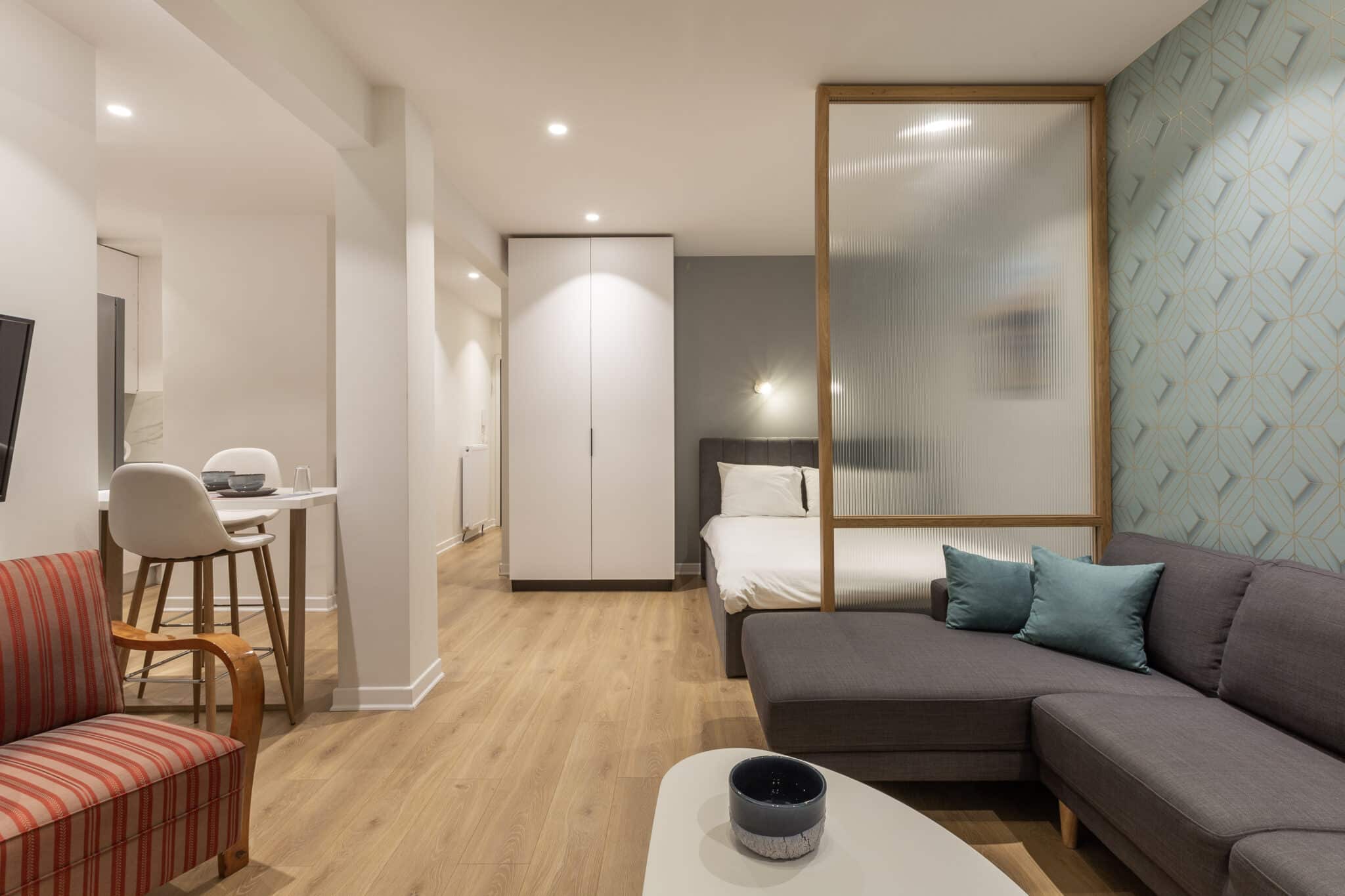 With its own private entrance, the apartment provides an added sense of independence from the moment you arrive. Inside, a bright and carefully arranged layout features a separate bedroom and a comfortable living room, creating distinct spaces to relax, unwind, or plan your day in the city.