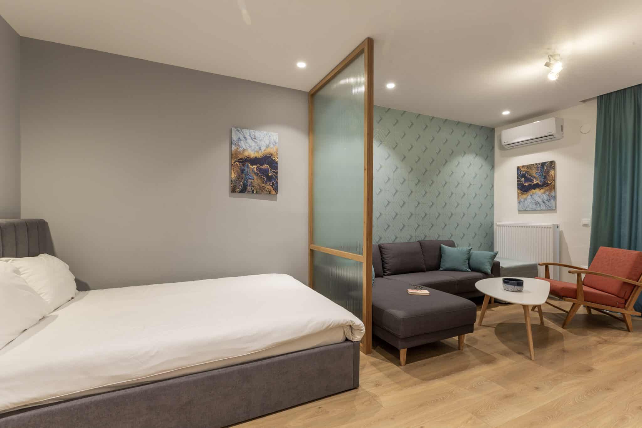 Thoughtfully designed for comfort, privacy and effortless living, the Deluxe Apartment at The Caravan Apartments offers a welcoming space where modern city style meets the feeling of home in the heart of Thessaloniki.